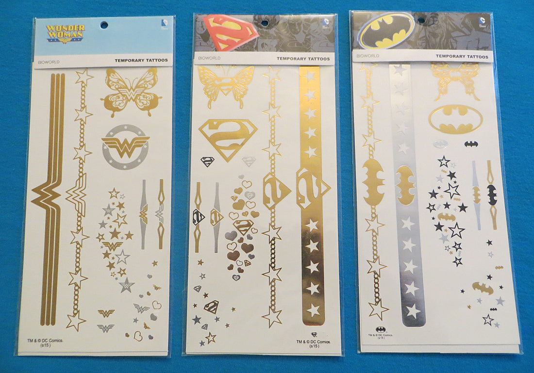 Officially licensed temporary tattoo sheets. One sheet of temproary tattoos for each Wonder Woman, Batman...