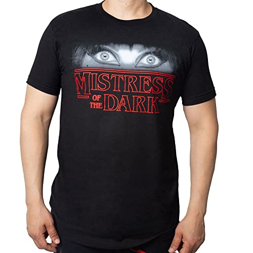 The Horror Hostess gets even stranger with her Mistress Things on this shirt featuring her iconic eyes and styled after the hit Netflix show. This black tee is officially licensed Elvira Mistress of the Dark merchandise, made of 100% cotton by monsters in the USA, and is machine washable. This is the perfect 80's nostalgia mash up shirt for anyone that loves cult classics and the newer television horror. Makes a great gift to wear to the next nerd convention, Halloween event, or spooky movie marathon.