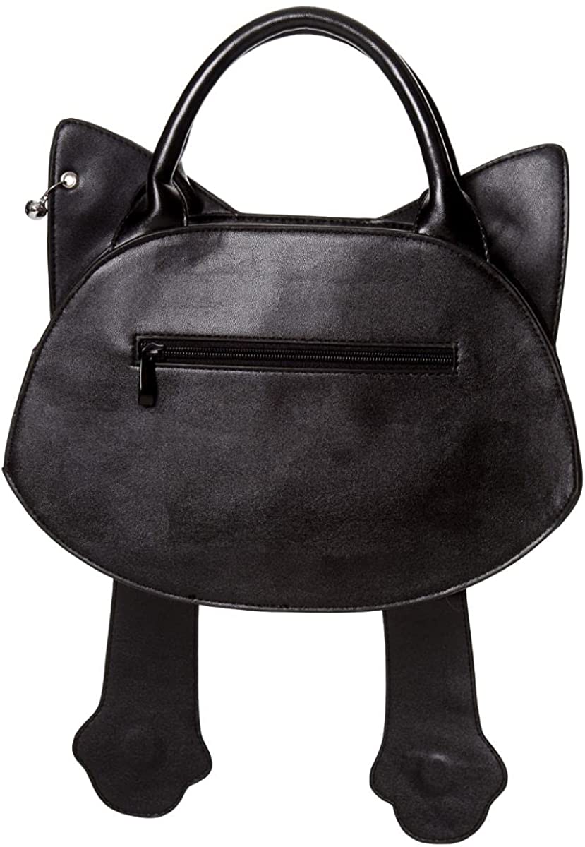 You've got to be kitten me! This paw-some bag is full of tricks and loves to play peek-a-boo! Each paw contains a small magnet that can cover an eye or hang down (approximately 6") for a fun, convertible look. The left ear has a small metal bell attached. The inside measures approximately 11"x8"x3" and has one zippered pocket and two open pockets. There is a zippered pocket on the back of the bag. The cartoon black cat inspired bag secures with a zipper closure and has a detachable, adjustable shoulder strap to transform from a shoulder bag into a hands-free crossbody. Made of vegan leather. Measures approximately 13"x10"x3" with a handle drop of approximately 4". Purr-fect for any feline lover.