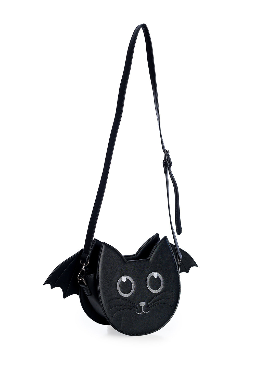 No kitten, the cutest bag has just flown in! This cat bat bag has detachable bat wings that make it magical. There is a full zipper closure and a removable, adjustable shoulder strap. There is one zippered pocket and one open pocket inside the bag. The cat face measures approximately 8.5"x9"x3.5 and the wings extend 4" out on either side. Made of vegan leather.