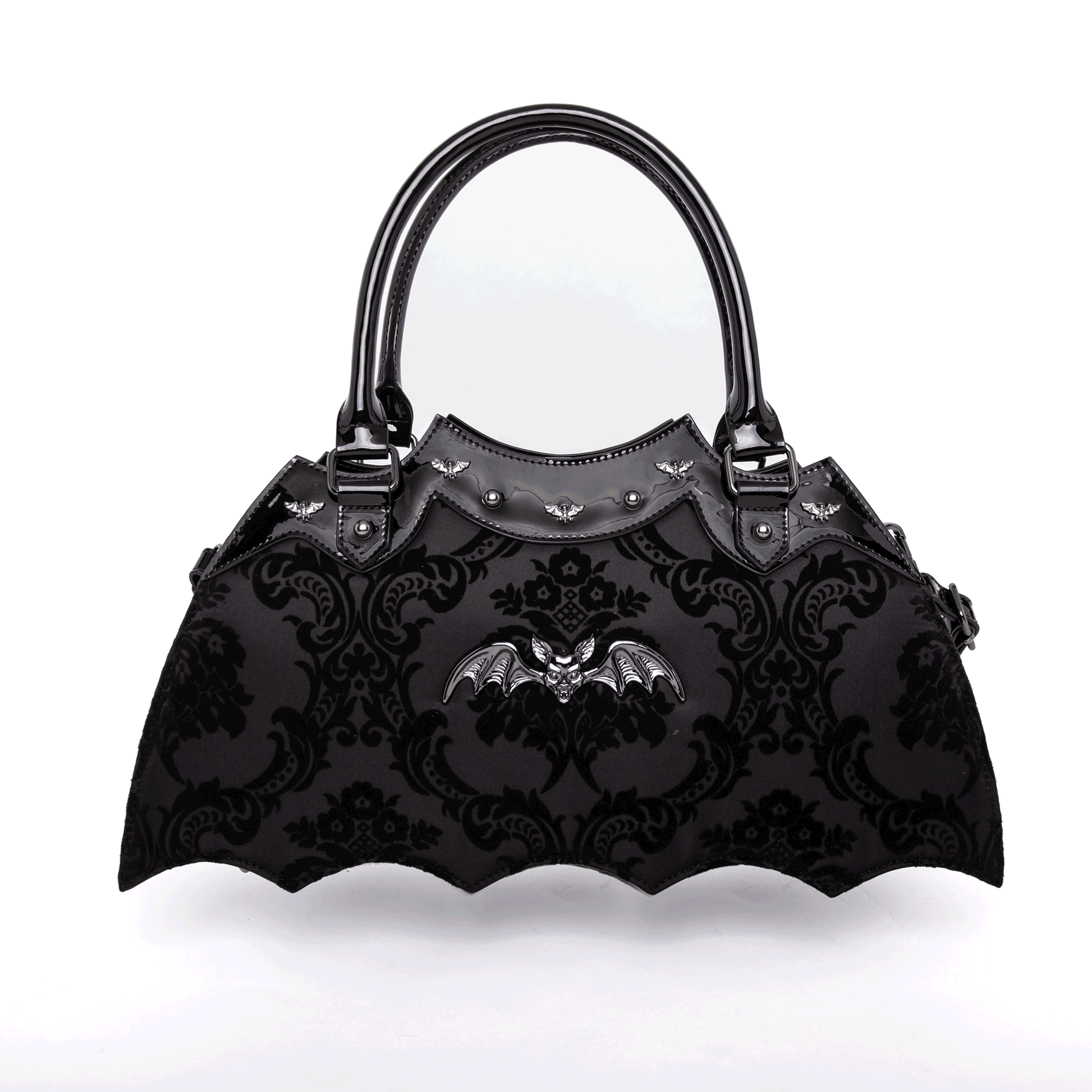 This Bat Shaped Damask Handbag features a damask print with the original "Lily bat" design on the front. The matte satin finish and flocked velvet damask pattern give it a luxory gothic feel, while the high-quality vegan PU leather trim and custom bat and dome studs add a touch of edginess. Perfect for any occasion, this handbag is sure to turn heads.