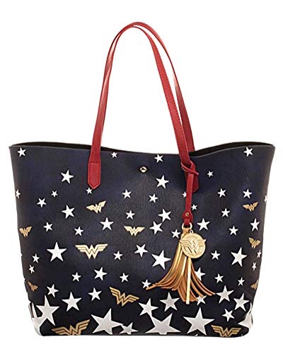 A bold print of gold Wonder Woman logos and white stars adds Themysciran style to...