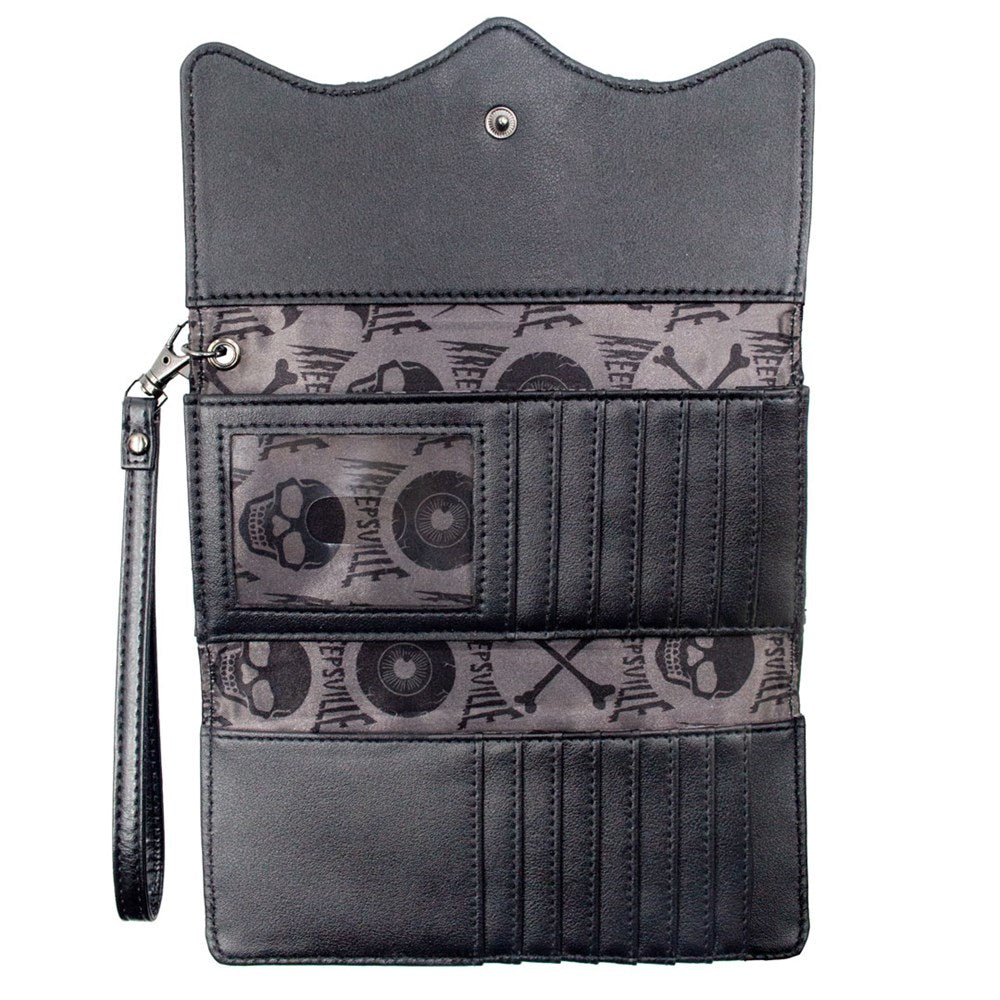 Kreepsville 666 Gothic Embossed Skull Death Bat Trifold Wristlet Wallet for Women