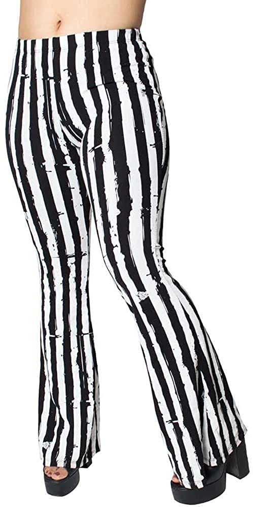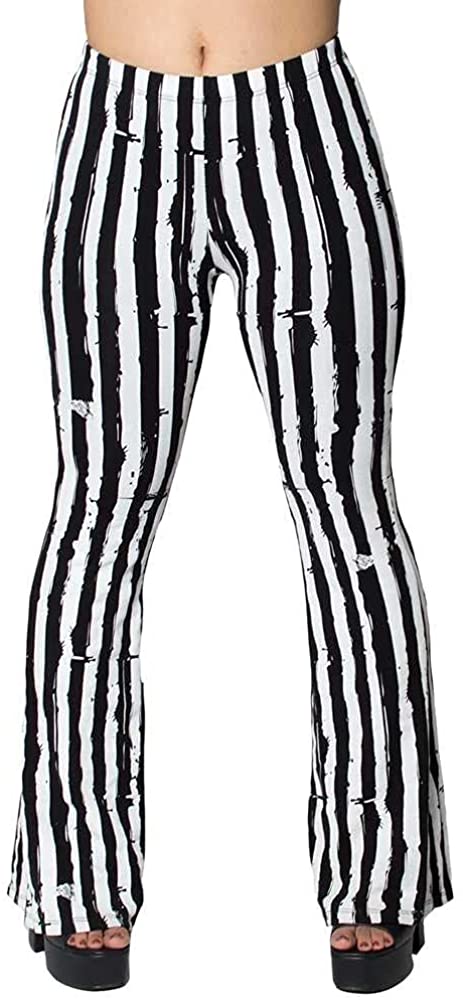 It's showtime! These strange and unusual flare leggings are what every ghost with the most needs. Made of 95% cotton and 5% spandex, they comfortably stretch to hug every curve and flare out at the calf. Each black and white stripe is distressed and unique, giving these pants a ton of character. Waistband is approximately 1" wide. Machine washable and made by monsters in the USA.