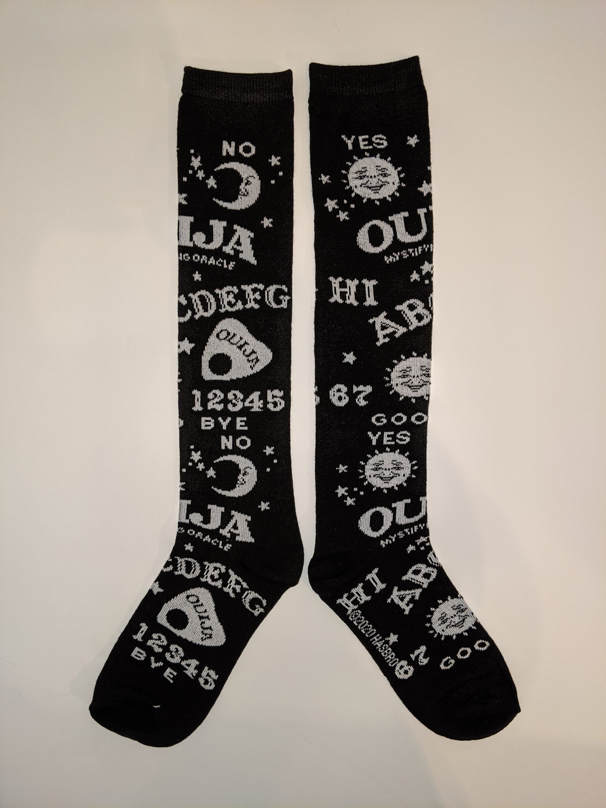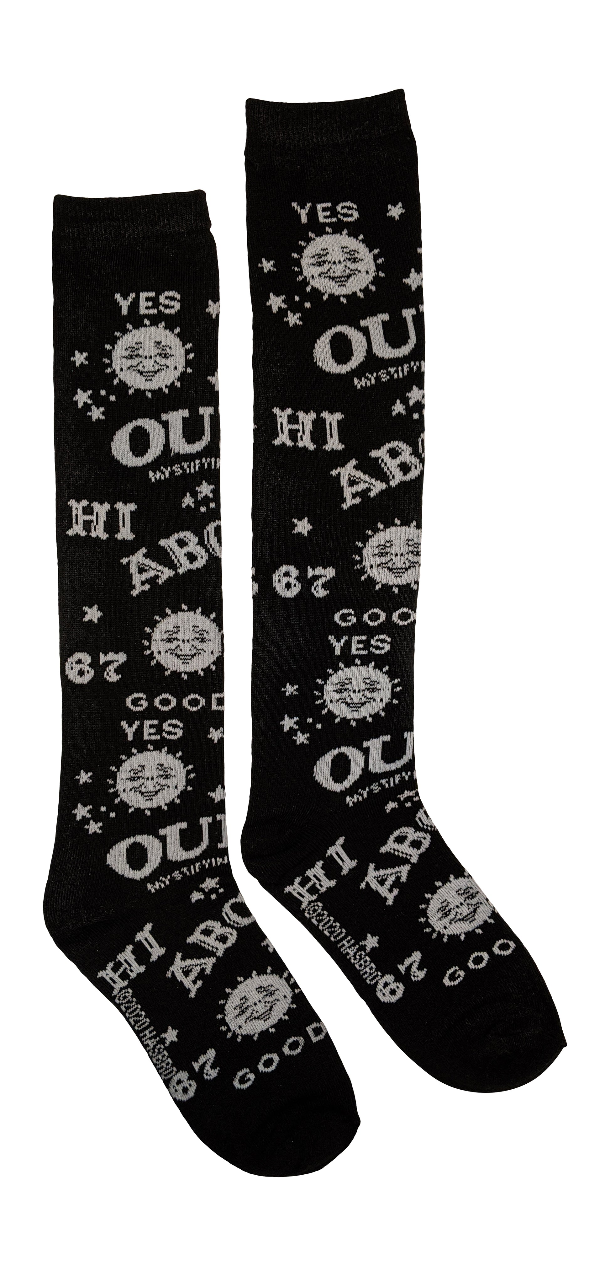 • Classic Ouija Board Design Features the Letters, Numbers, Sun, Moon and Planchette Printed on the Socks as Well as the iconic phrase: Mystifying Oracle